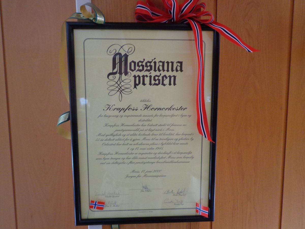 Det var smått om instrumenter. Det første året leiet musikantene instrumenter fra Son kommune, og man fant også instrumenter fra et tidligere korps på stedet. Korpsets navn den første tiden var Krapfoss Musikkforening, og det første tegn på uniformer var hvite luer med sort kokarde med bokstavene K.H. malt i gull. Orkesteret har siden vært en aktiv bidragsyter i kulturlivet i Moss, noe som bl.a. resulterte i at de fikk Mossianaprisen i år 2000.
